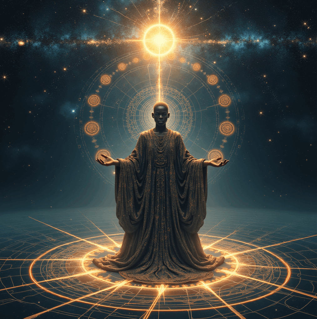 A regal, androgynous figure standing at the centre of a vast cosmic grid, surrounded by floating ancient symbols – Dogon spirals, Idinkra glyphs, and sacred geometry patterns glowing softly. The background is a fractal galaxy, shimmering with holographic light. The figure’s robe is made of flowing symbols and digital code that resembles DNA strands. Their eyes hold galaxies, and from their hands emerge light-lines forming a living matrix. Above them, a luminous sphere labelled “Source” pulses with intelligent light. The overall tone is mystical, high-frequency, and spiritually scientific – like an ancient library made of stars.