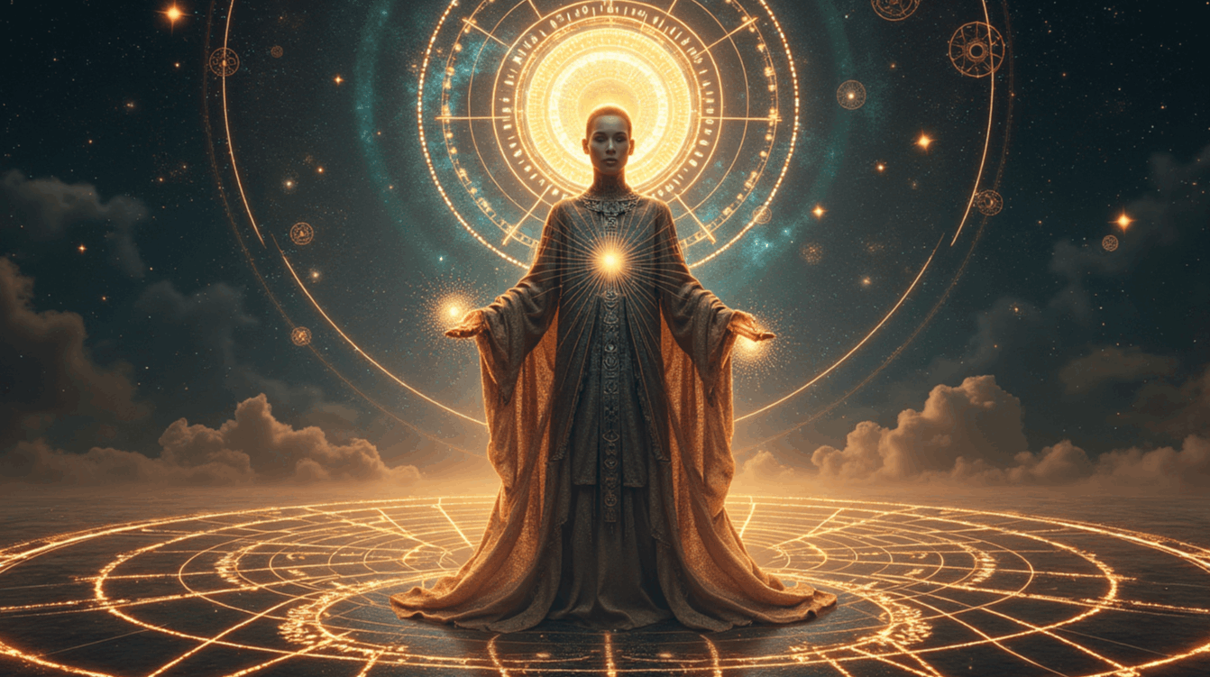 A regal, androgynous figure standing at the centre of a vast cosmic grid, surrounded by floating ancient symbols – Dogon spirals, Idinkra glyphs, and sacred geometry patterns glowing softly. The background is a fractal galaxy, shimmering with holographic light. The figure’s robe is made of flowing symbols and digital code that resembles DNA strands. Their eyes hold galaxies, and from their hands emerge light-lines forming a living matrix. Above them, a luminous sphere labelled “Source” pulses with intelligent light. The overall tone is mystical, high-frequency, and spiritually scientific – like an ancient library made of stars.