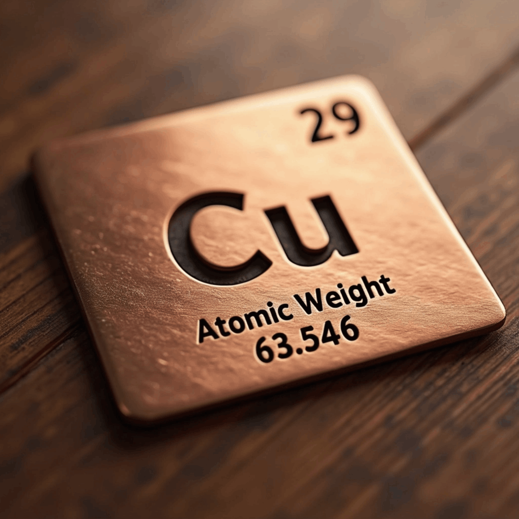 The plate should have a warm, reddish metallic sheen with subtle texture and light reflections. Center the symbol “Cu” in bold, elegant typography, with the atomic number 29 above it and the “Atomic Weight 63.546” below. The engraving should appear slightly recessed, with shadows and highlights to emphasize depth.