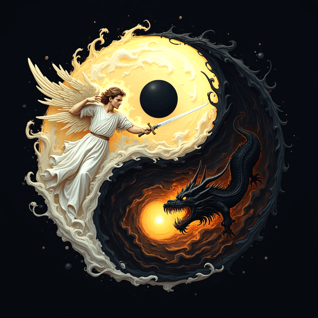 A reimagined Yin Yang symbol with a creative twist. The central design retains the classic Yin Yang balance: two flowing teardrop-like shapes with contrasting dots inside – one black, one white – forming harmony. But instead of a perfect outer circle, the edges curve more dynamically, like water drops flowing into each other. On the bright white side, depict Archangel Michael, radiant and powerful, holding a shining sword, embodying divine protection and light.