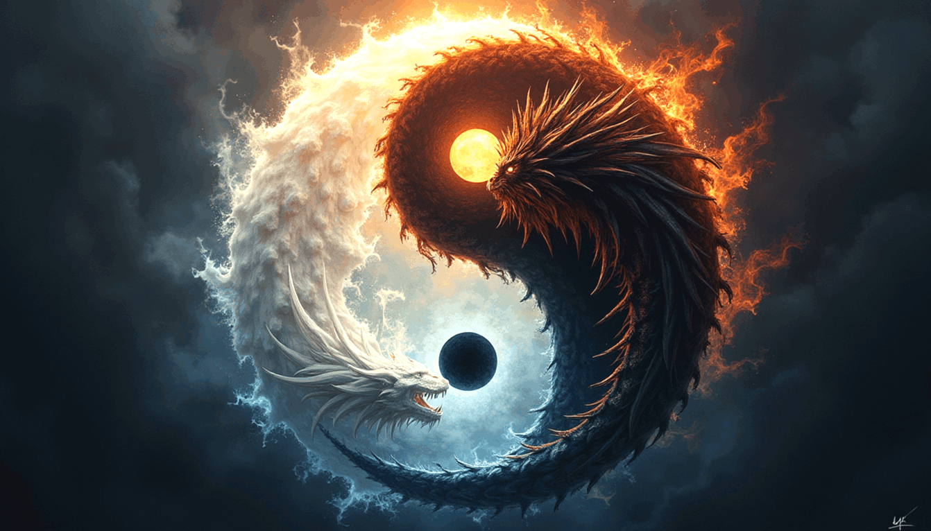 On the dark black side, illustrate a fiery dragon emerging from shadows, fierce and menacing, symbolizing chaos and darkness.