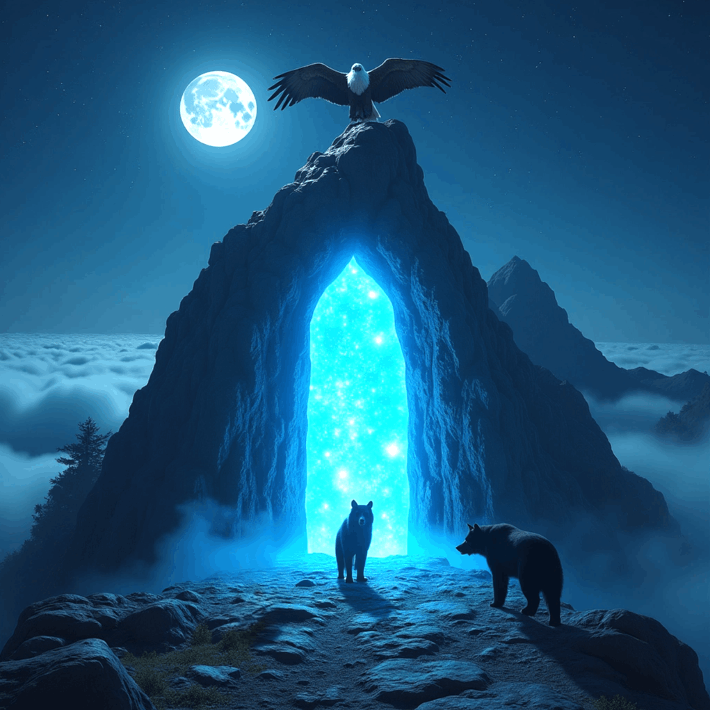 For many days and nights, Wolf and Bear climbed that mountain, until finally they reached the top. At first, nothing seemed unusual. But when Eagle’s claws touched the ground, a hidden door appeared, shimmering with light.