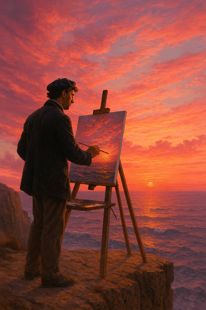 A realistic, photo-like image of a French-looking painter standing on the edge of a rugged cliff at sunset. He wears a black beret and a long coat, with wind gently tousling his hair. Beside him stands a wooden easel holding a canvas that mirrors the breathtaking view: a glowing pink and orange sunset over a calm ocean. The sky is filled with swirling clouds in soft hues, and the cliff is textured with jagged rocks and sparse greenery. The painter holds a brush mid-stroke, capturing the beauty before him with deep focus and reverence.”